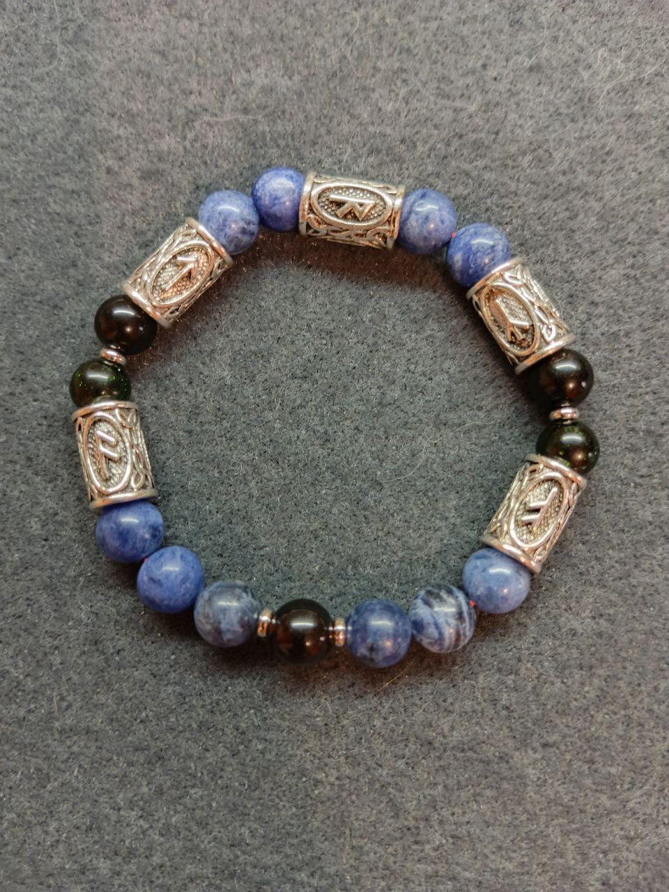 Руны ансуз+тейваз+райдо+альгиз+феху • Содалит • Авантюрин (зелёный) • Обсидиан