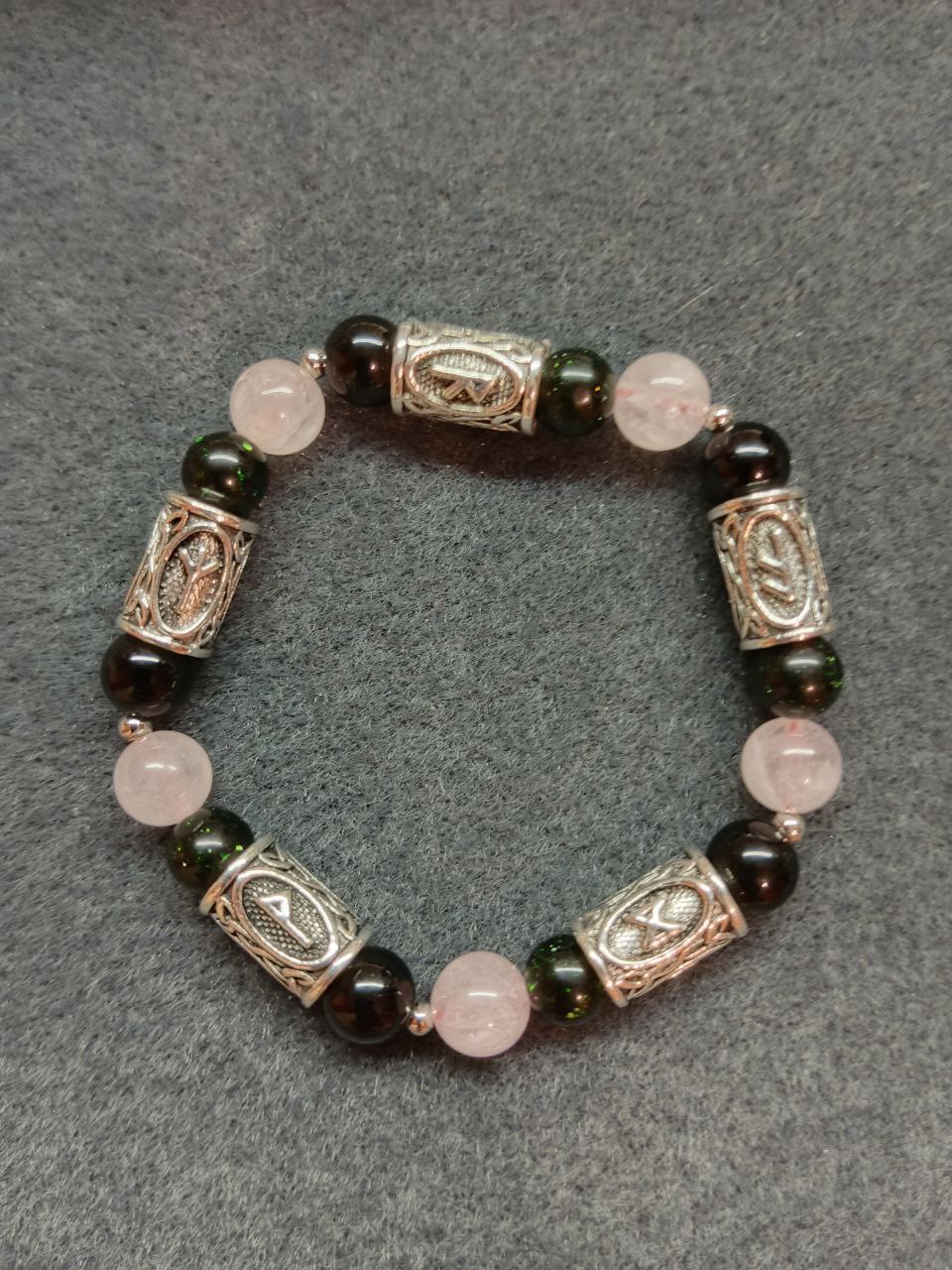 Руны райдо+ансуз+дагаз+вуньо+альгиз • Розовый кварц • Авантюрин (зелёный) • Обсидиан
